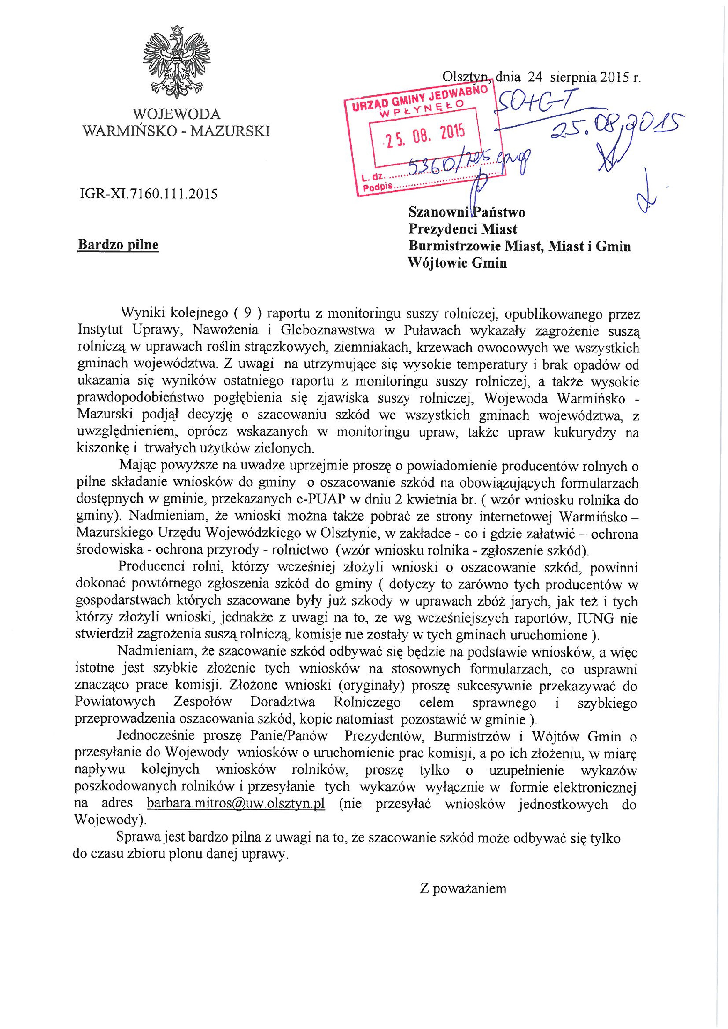 Pismem znak: IGR-XI.7160.111.2015 z dnia 24.08.2015 r. (wpływ do Urzędu Gminy – 25.08.2015r.) Wojewoda Warmińsko-Mazurski podjął decyzję o szacowaniu szkód we wszystkich Gminach województwa z uwzględnieniem oprócz wskazanych w monitoringu upraw, także upraw kukurydzy na kiszonkę i trwałych użytków zielonych.