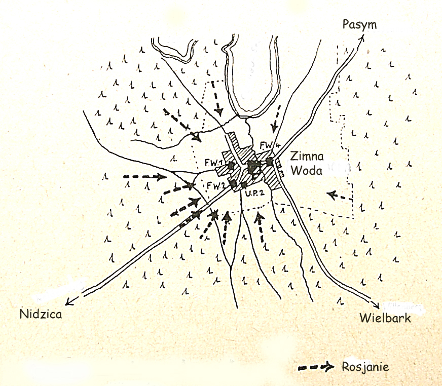 nr.2Poruszające się po drodze na Zimną Wodę za przodującymi jednostkami, główne siły korpusu zatrzymały się u wyjścia z lasu niedaleko polany na północ od tej wsi. Walka, jaką odbyto tu z pruskimi huzarami, potwierdzała, że droga na Wały zajęta jest przez Niemców. W tej walce kolejne ciężkie rany odniósł dowódca 1. Newskiego pułku, pułkownik Pierwuszyn. Zawsze na przedzie, podrywający żołnierzy do walki, właśnie w Zimnej Wodzie wydał decyzję o ukryciu pułkowego sztandaru. Jesienią 1914 roku, dwaj żołnierze tego pułku, przebrani w cywilne ubrania przekradli się do Prus i odkopane płótno wynieśli do Rosji. W mazurskim piachu, gdzieś blisko wsi pozostały złamane drzewce, grot i reszta okuć, których nie chcieli mieć przy sobie. Płótno sztandaru powróciło owinięte dookoła ciała jednego z nich. W zgodzie ze wspomnieniami znamienszczik czyli ?sztandarowy? wraz z drugim podoficerem i jednym z oficerów oddalili się od polany, gdzie zatrzymało wojsko aby zakopać sztandar w dziurze wykopanej pod pniem jednego z drzew. Potyczka zakończyła się zwycięstwem Rosjan. Zdobyto nawet jakieś armaty, które należały do pruskiego 73 regimentu artylerii polowej Wtedy jednak gen. Klujew polecił kolumnie zawrócić do skrzyżowania dróg, na którym rozeszły się oba korpusy w nadziei, że droga na Muszaki jest jeszcze wolna i kolumnie uda się przejść po niej w ślad za jednostkami XV Korpusu. Ale wyjście z lasu drogą na Muszaki także było już zaryglowane przez przeciwnika. Doprowadzone jednostki ostatecznie zmieszały się tu z resztkami XV Korpusu. Rejon wyjścia z lasu ostrzeliwano ogniem szrapneli w różnych kierunkach, dlaczego też w rosyjskich jednostkach narastało wrażenie, że otoczone są ze wszystkich stron. Tak okrążone niedobitki doczekały tu ranka 30 sierpnia. Co zostało ukryte w tym rejonie, wciąż pozostaje tajemnicą. Zdezorganizowane jednostki pozbywały się oporządzenia i zdobycznego dobra począwszy przede wszystkim od tego właśnie rejonu.