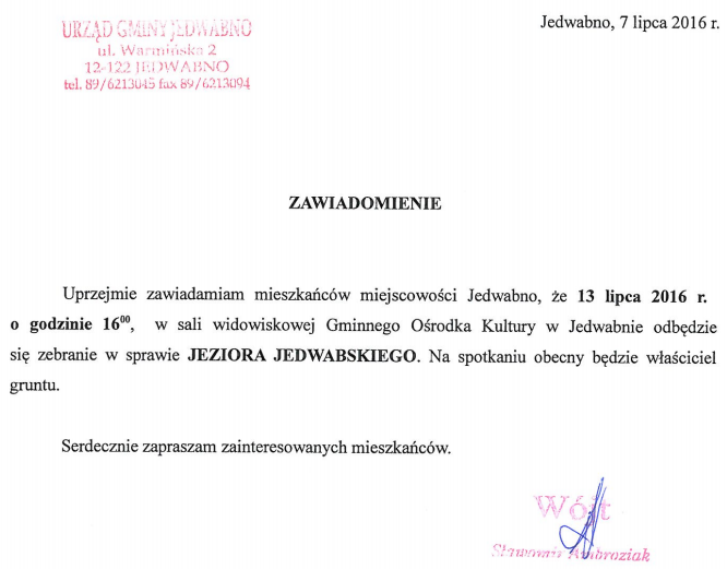 Szanowni Państwo, 13 lipca 2016 r. organizujemy spotkanie z mieszkańcami Jedwabna, w sprawie Jeziora Jedwabskiego. Z uwagi na wagę zagadnienia i emocje jakie wywołuje powyższa sprawa, prosimy o liczne przybycie.