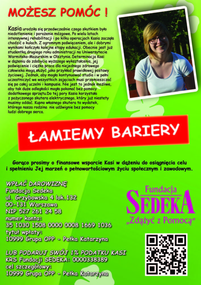Kasia urodziła się przedwcześnie czego skutkiem było niedotlenienie i porażenie mózgowe. Po wielu latach intensywnej rehabilitacji i po kilku operacjach Kasia zaczęła chodzić o kulach. Z ogromnym poświęceniem, ale i dobrymi wynikami kończyła kolejne etapy edukacji. Obecnie jest studentką drugiego roku administracji na Uniwersytecie Warmińsko-Mazurskim w Olsztynie. Determinacja Kasi do zdobycia wyższego wykształcenia, jej poświęcenie i ciężka praca dla niejednego zdrowego człowieka mogą służyć jako przykład prawidłowej postawy życiowej. Jednak, aby mogła kontynuować studia i w pełni uczestniczyć we wszystkich zajęciach musi przemieszczać się po całej uczelni i kampusie. Nie jest to jednak możliwe, aby tak duże odległości mogła pokonać bez pomocy dodatkowego sprzętu. Do tej pory Kasia korzystała z pożyczonego skutera elektronicznego, który już niestety musi oddać. Kupno nowego skutera to wydatek, którego rodzina Kasi nie udźwignie bez pomocy ludzi dobrego serca.