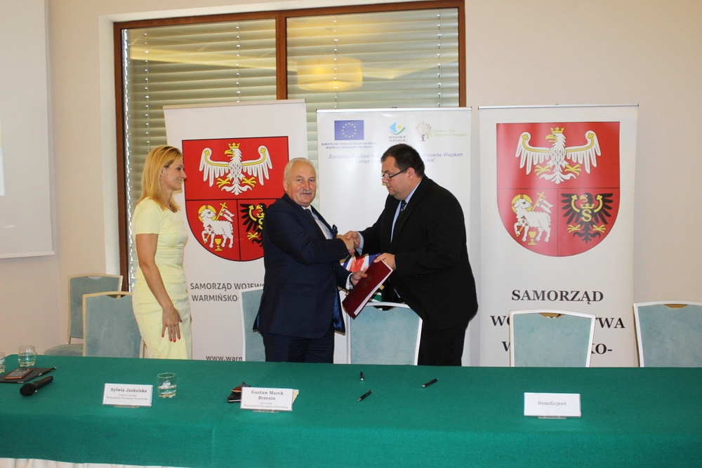 25 sierpnia 2016 r. umowy z Marszałkiem Województwa Panem Gustawem Markiem Brzezinem podpisał Wójt Gminy Jedwabno pan Sławomir Ambroziak wraz ze Skarbnik Gminy Panią Wiolettą Gil.