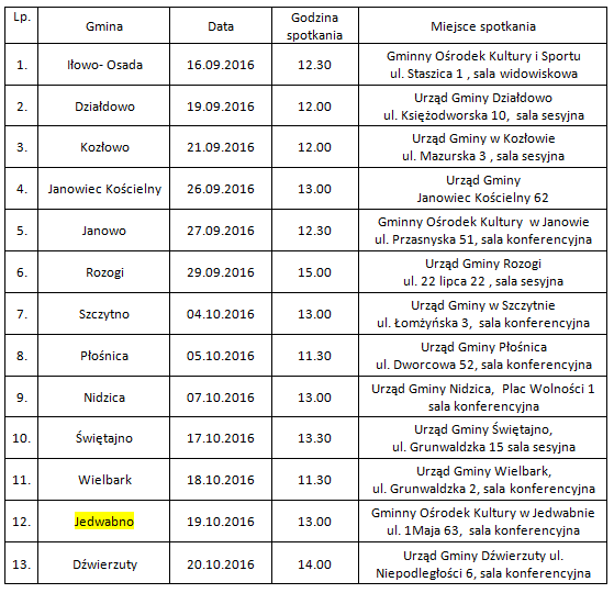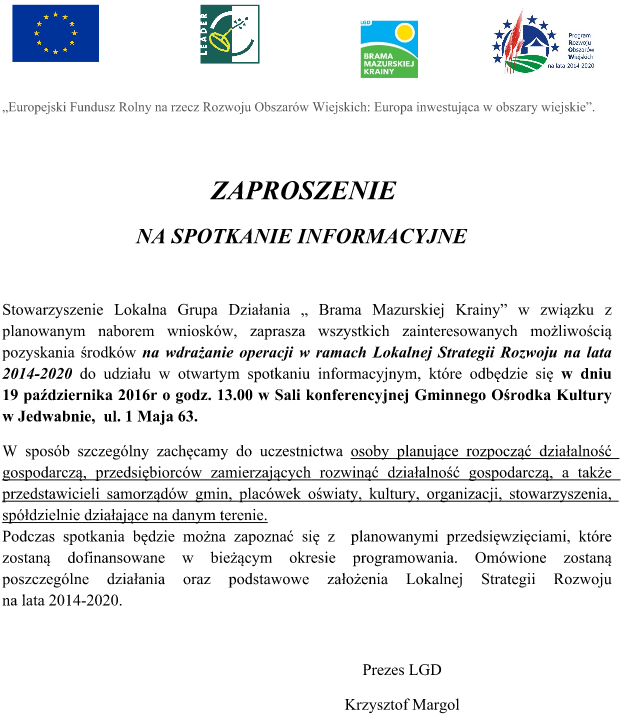 Stowarzyszenie Lokalna Grupa Działania ?Brama Mazurskiej Krainy? w związku z planowanym naborem wniosków, zaprasza wszystkich zainteresowanych możliwością pozyskania środków na wdrażanie operacji w ramach Lokalnej Strategii Rozwoju na lata 2014-2020 do udziału w otwartych spotkaniach informacyjnych zgodnie z załączonym harmonogramem.
