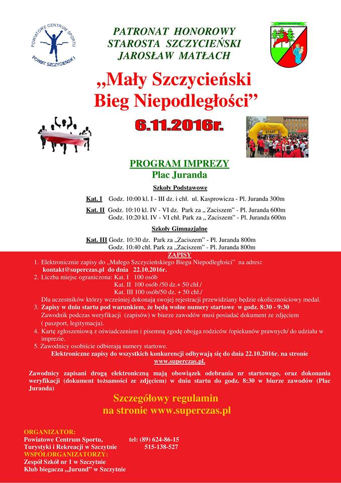 W imieniu Organizatorów zapraszamy na „Mały Szczycieński Bieg Niepodległości” oraz na „Szczycieński Bieg Niepodległości” 6 listopada 2016 r.