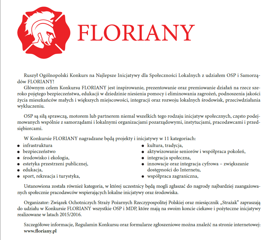 Serdecznie zapraszamy do udziału w Ogólnopolskim Konkursie na Najlepsze Inicjatywy dla Społeczności Lokalnych z udziałem OSP i Samorządów ? FLORIANY. Głównym przesłaniem konkursu jest inspirowanie, prezentowanie oraz premiowanie działań na rzecz szeroko pojętego bezpieczeństwa, edukacji w dziedzinie niesienia pomocy i eliminowania zagrożeń, podnoszenia jakości życia, integracji oraz rozwoju lokalnych środowisk i przeciwdziałania wykluczeniu.