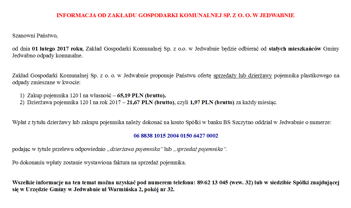 Informacja w sprawie odbioru odpadów od Zakładu Gospodarki Komunalnej Sp. z o. o. w Jedwabnie