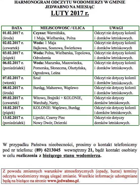 Harmonogram odczytu wodomierzy w gminie Jedwabno ? Luty 2017 r.