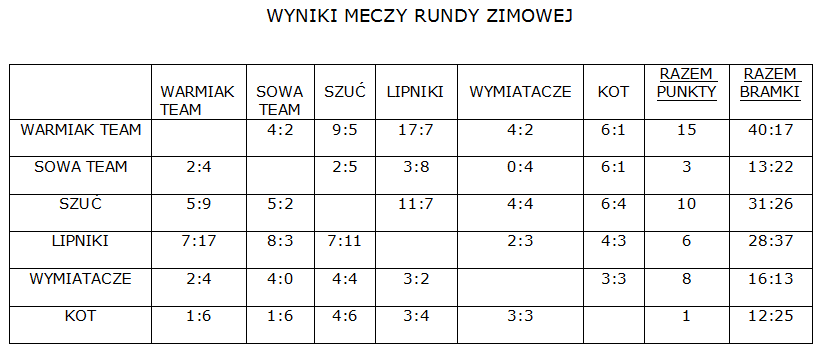 Runda zimowa, licząca pięć kolejek, zakończyła się prowadzeniem drużyny Warmiak Team, tuż przed drużyną Szuci. Poniżej tabela szczegółowo ilustrująca zdobyte punkty.
