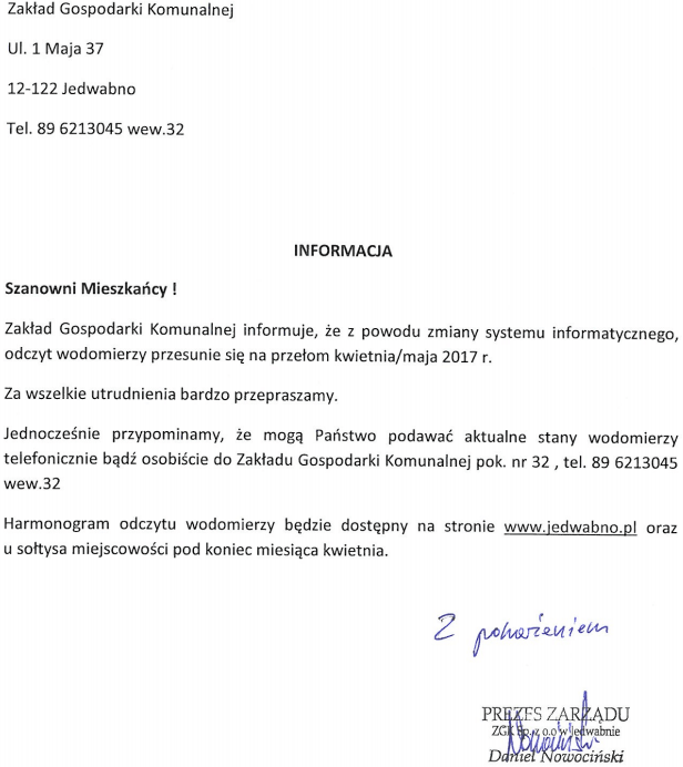 ZGK Jedwabno – Informacja – odczyty wodomierzy
