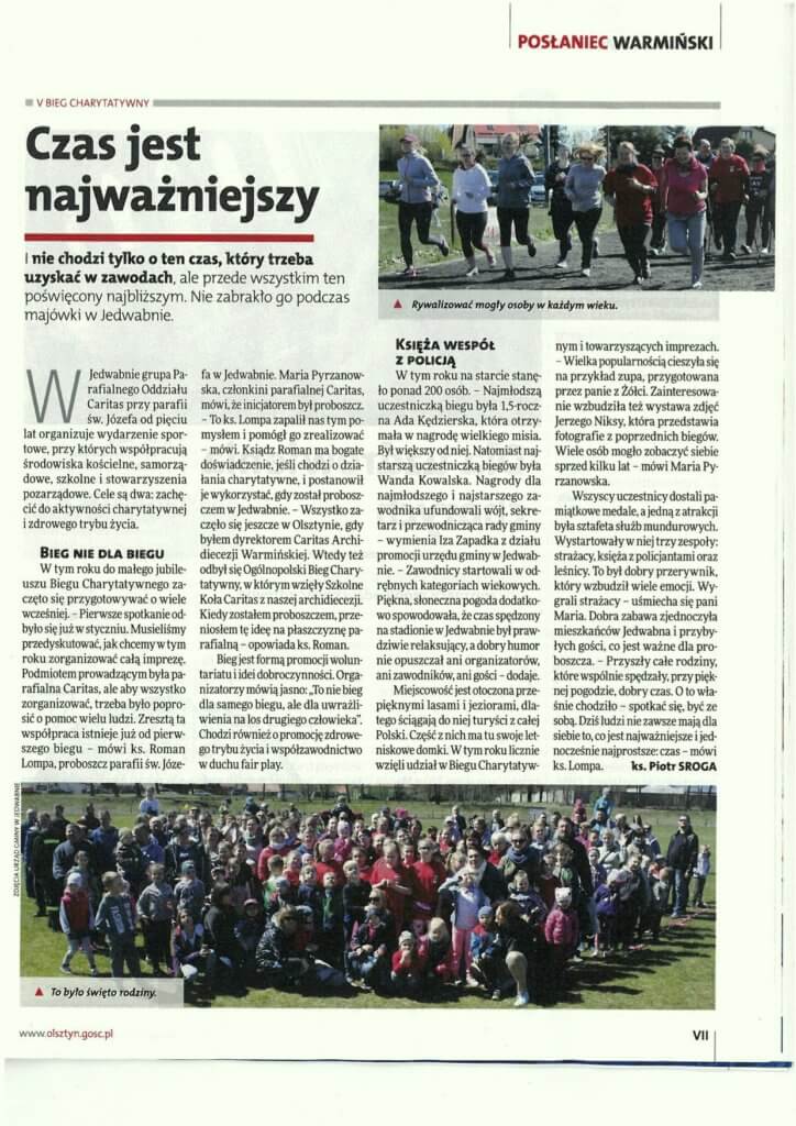 1 maja 2017 r. w Jedwabnie odbyła się impreza sportowa zorganizowana przez Parafialny Zespół Caritas przy Parafii św. Józefa w Jedwabnie. Bieg Caritas ?W zdrowym ciele zdrowy duch? odbył się w tym roku po raz piąty. O pomyśle na tak wspaniałe wydarzenie przyciągające tłumy uczestników i początkach jej powstania oraz o tegorocznym przedsięwzięciu pisze Posłaniec Warmiński w numerze 19, który dostępny będzie 14 maja 2017 r. w Kościele w Jedwabnie.