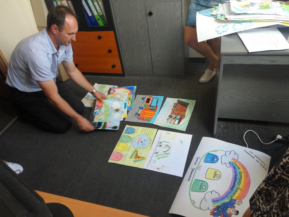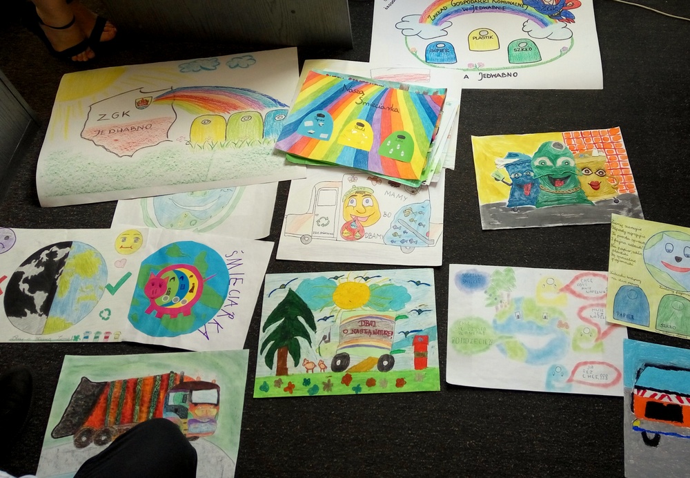 Do konkursu wpłynęło aż 60 prac – uczniów i przedszkolaków z Zespołu Szkół w Jedwabnie! Wszystkie kolorowe, przemyślane i dopracowane, więc obrady były tym bardziej burzliwe. Trudno było wybrać tą jedną – która ozdobi zabudowę śmieciarki należącej do ZGK Sp. z o. o. w Jedwabnie.