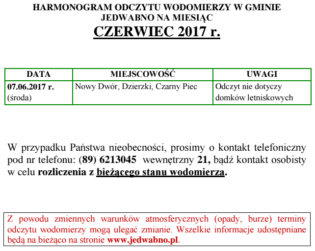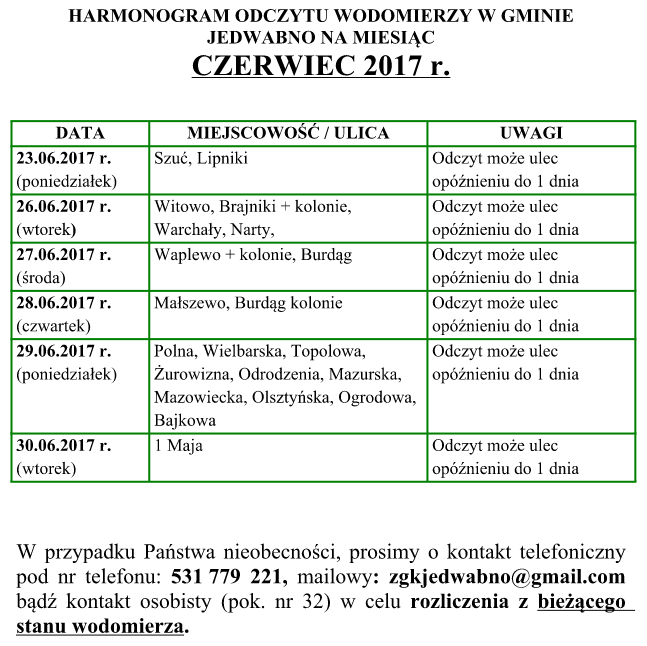 Harmonogramu odczytu wodomierzy – czerwiec 2017