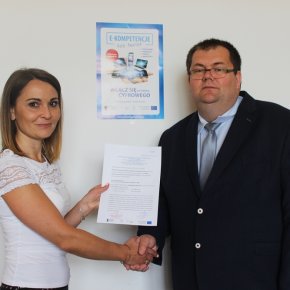 22 czerwca 2017 r. miało miejsce uroczyste przekazanie sprzętu teleinformatycznego wraz z oprogramowaniem w celu realizacji założeń programu „E-Kompetencje bez barier” Dyrektor Centrum Edukacji w Szczytnie Pani Barbara Świerczyńska przekazała na ręce Wójta Gminy Jedwabno Sławomira Ambroziak sprzęt służący do prowadzenia zajęć w e-klubie zlokalizowanym w Zespole Szkół w Jedwabnie.