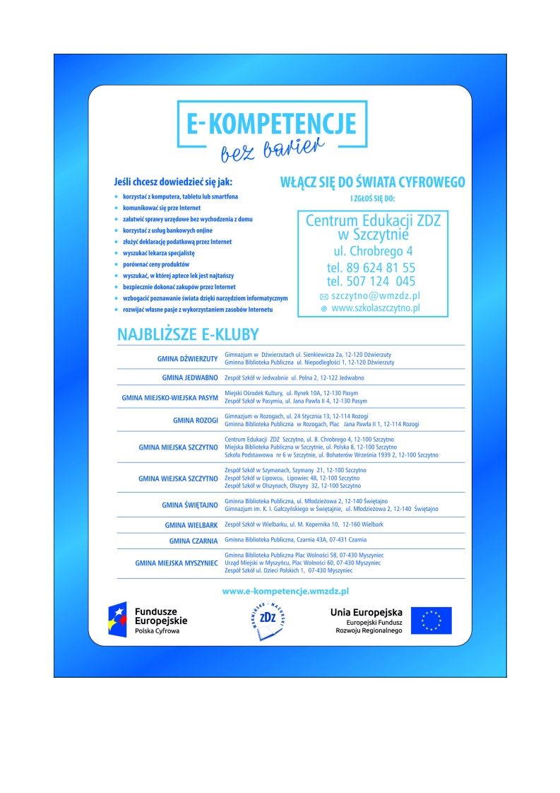 Warmińsko-Mazurski Zakład Doskonalenia Zawodowego w Olsztynie, Centrum Edukacji w Szczytnie w porozumieniu z 56 Gminami, w tym z Gminą Jedwabno, realizuje projekt „E-KOMPETENCJE bez barier” w ramach Programu Operacyjnego Polska Cyfrowa na lata 2014-2020, oś priorytetowa III Cyfrowe kompetencje społeczeństwa, Działanie 3.1 Działania szkoleniowe na rzecz rozwoju kompetencji cyfrowych, współfinansowany ze środków Unii Europejskiej w ramach Europejskiego Funduszu Rozwoju Regionalnego.