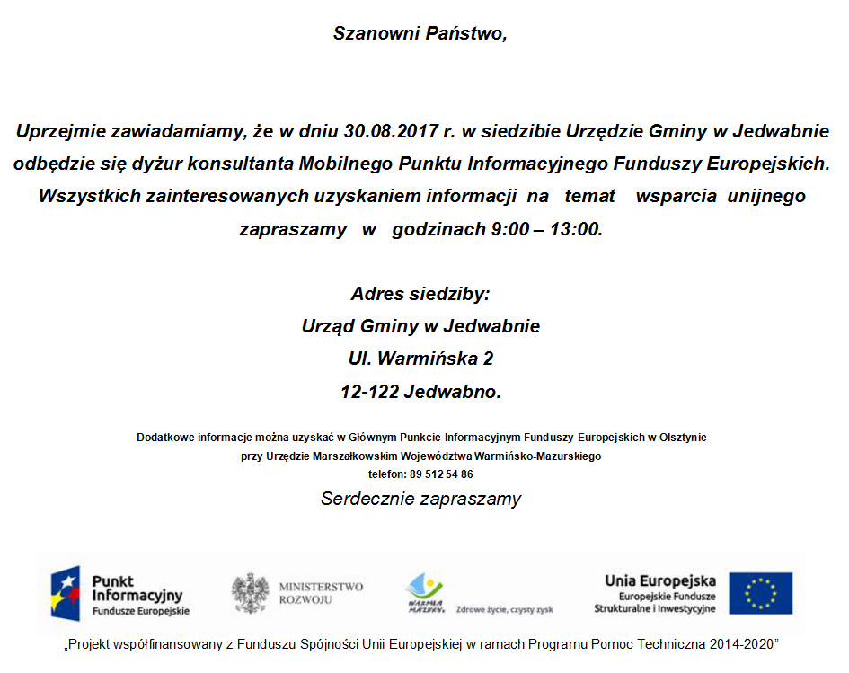 3. Dyżur Konsultanta Mobilnego Punktu Informacji Funduszy Europejskich – 30 sierpnia 2017 r.