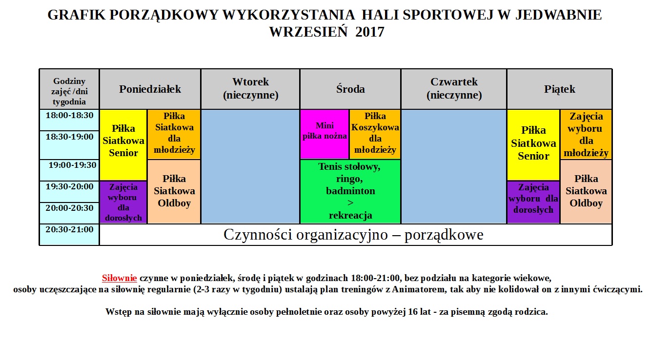 Grafik porządkowy wykorzystania Hali Sportowej w Jedwabnie na miesiąc wrzesień 2017 r.