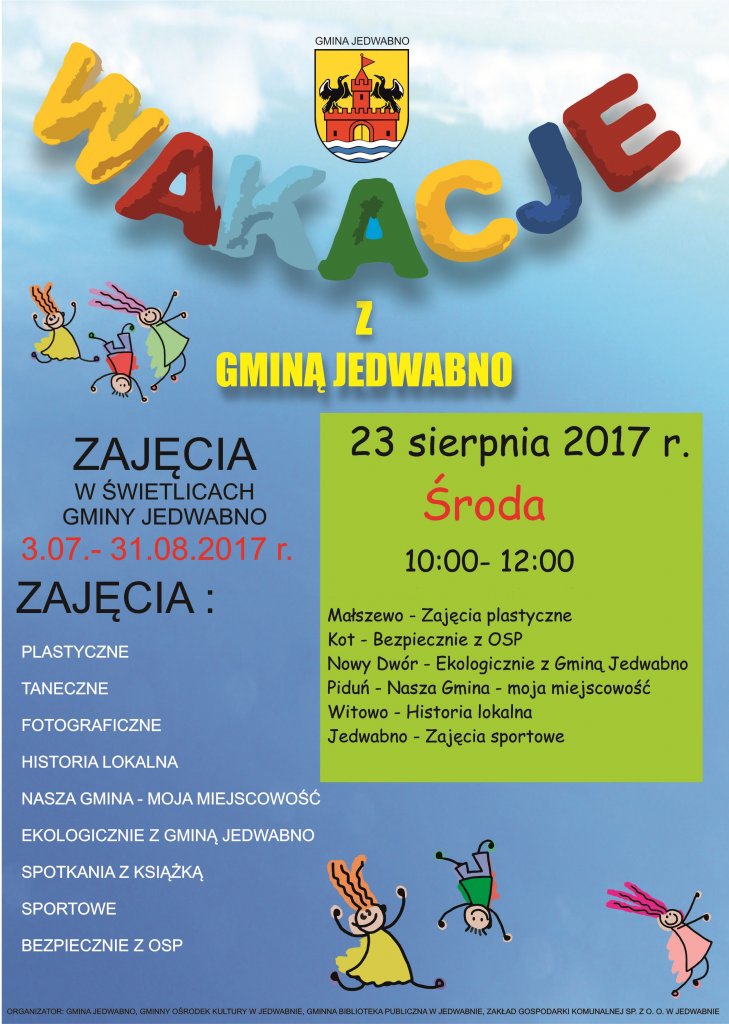 Wakacje zbliżają się ku końcowi, a tym samym kończymy cykl zajęć edukacyjnych dla dzieci w świetlicach na terenie gminy Jedwabno. Ostatnie zajęcia odbędą się w środę 23 sierpnia 2017 r., zgodnie z poniższym grafikiem.