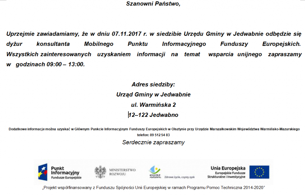 Dyżur Konsultanta Mobilnego Punktu Informacji Funduszy Europejskich – 7 listopada 2017 r.