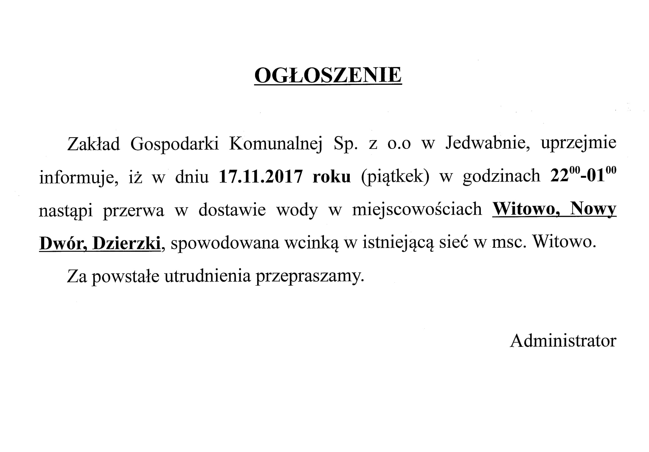 Przerwa w dostawie wody – Witowo, Nowy Dwór, Dzierzki!