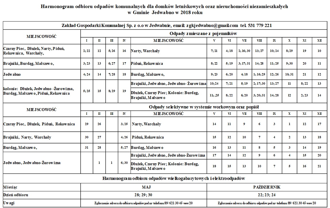 Informujemy również, że od 10 stycznia 2018 roku zmianie uległa firma obsługująca nieruchomości letniskowe, rekreacyjno-wypoczynkowe oraz nieruchomości niezamieszkałe położone na terenie Gminy Jedwabno. W chwili obecnej odbiorem odpadów zajmuje się Zakład Gospodarki Komunalnej Sp. z o.o z siedzibą w Jedwabnie ul. 1 Maja 63.