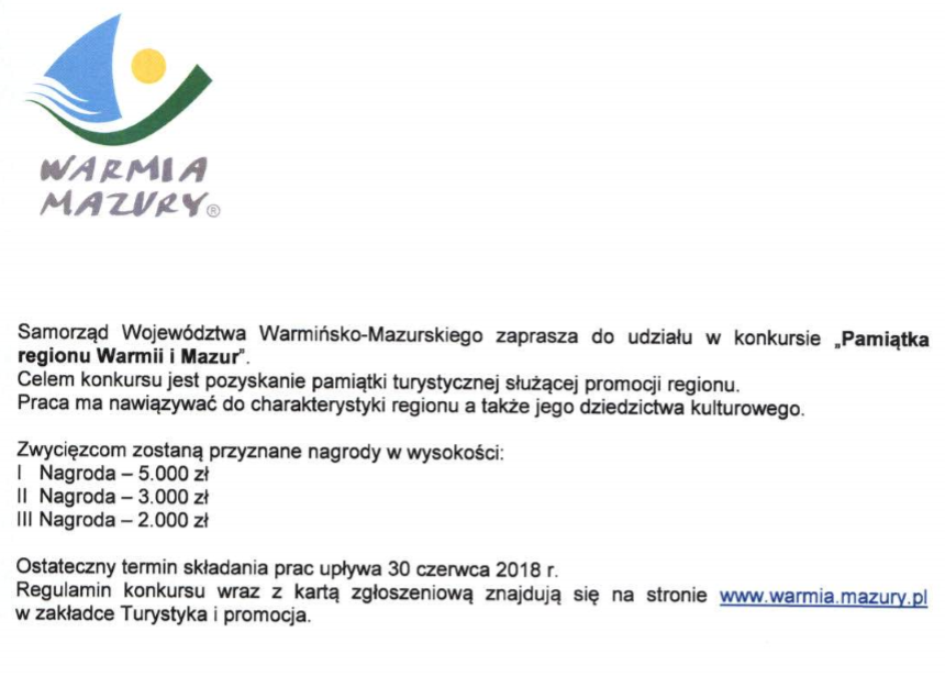 Więcej informacji: http://warmia.mazury.pl/turystyka-i-promocja/aktualnosci/1924-samorzad-wojewodztwa-poszukuje-regionalnej-pamiatki