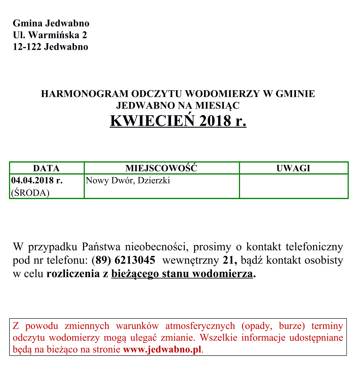 3. Harmonogram odczytu wodomierzy – kwiecień 2018 r.