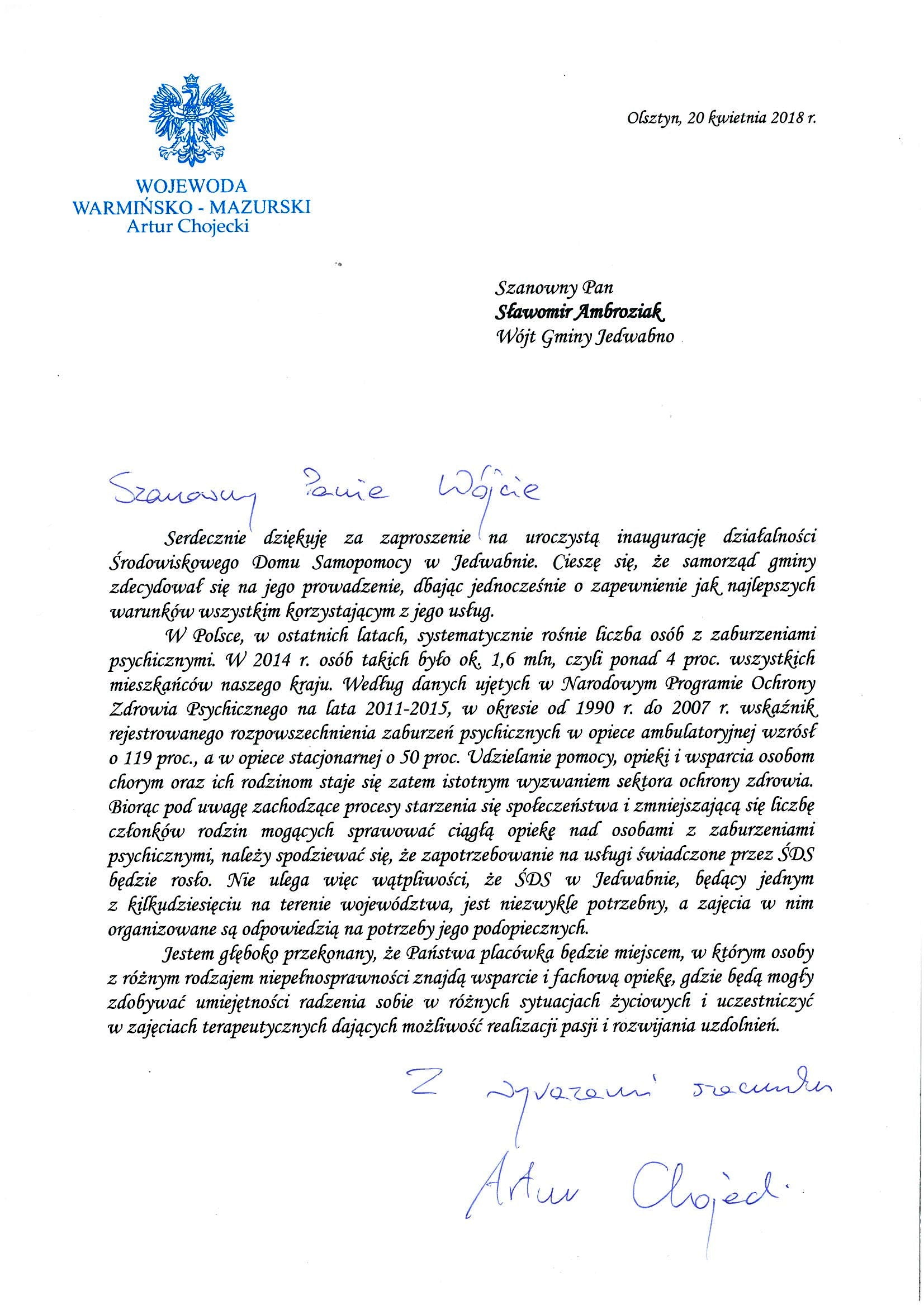 Poniżej przedstawiamy list Wojewody Warmińsko-Mazurskiego, który podczas uroczystości odczytał Dyrektor Wydziału Polityki Społecznej Warmińsko-Mazurskiego Urzędu Wojewódzkiego w Olsztynie Pan Marcin Jastrzębski.