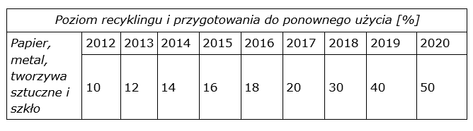 Zgodnie z art. 3 ust. 2 pkt 9 ustawy z dnia 13 września 1996r. o utrzymaniu czystości i porządku w gminach (t.j. Dz. U. z 2017 r. poz.1289) oraz Rozporządzenia Ministra Środowiska z dnia 29 maja 2012 r., Gmina Jedwabno informuje o osiągniętych w 2017 r. poziomach recyklingu, przygotowania do ponownego użycia i odzysku innymi metodami oraz ograniczenia masy odpadów biodegradowalnych przekazywanych do składowania nietepujące wartości. Gmina Jedwabno w poszczególnych latach jest zobowiązana osiągnąć następujące poziomy recyklingu: