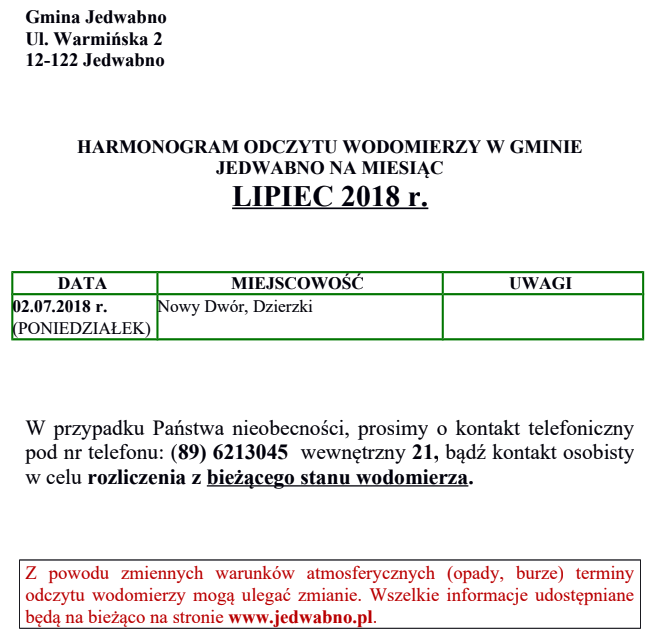 Harmonogram odczytu wodomierzy – lipiec 2018 r.