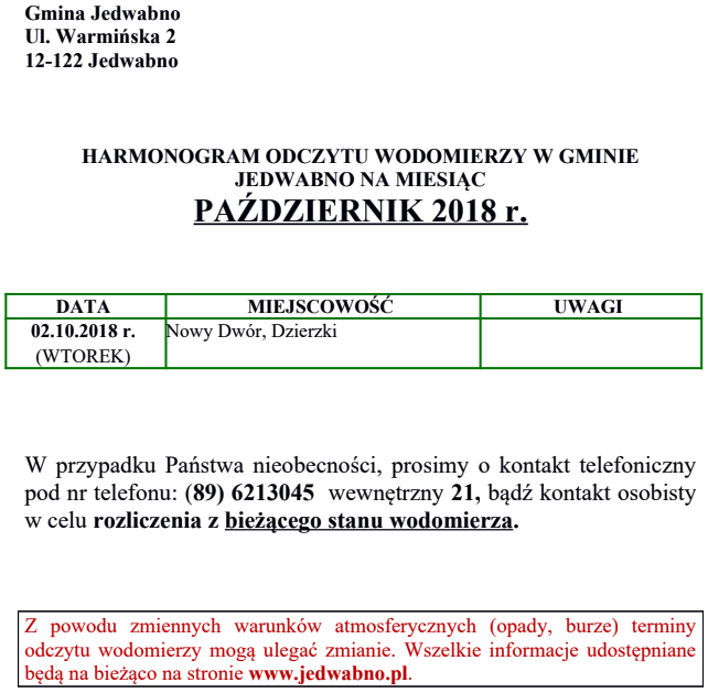 Harmonogram odczytu wodomierzy – październik 2018 r.
