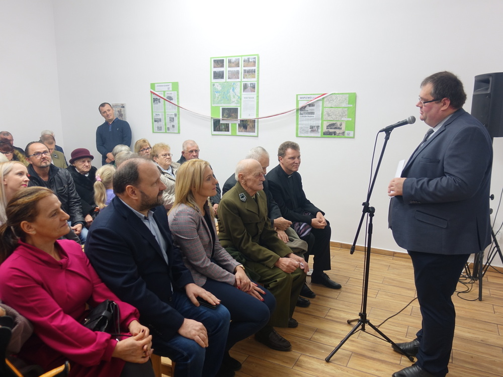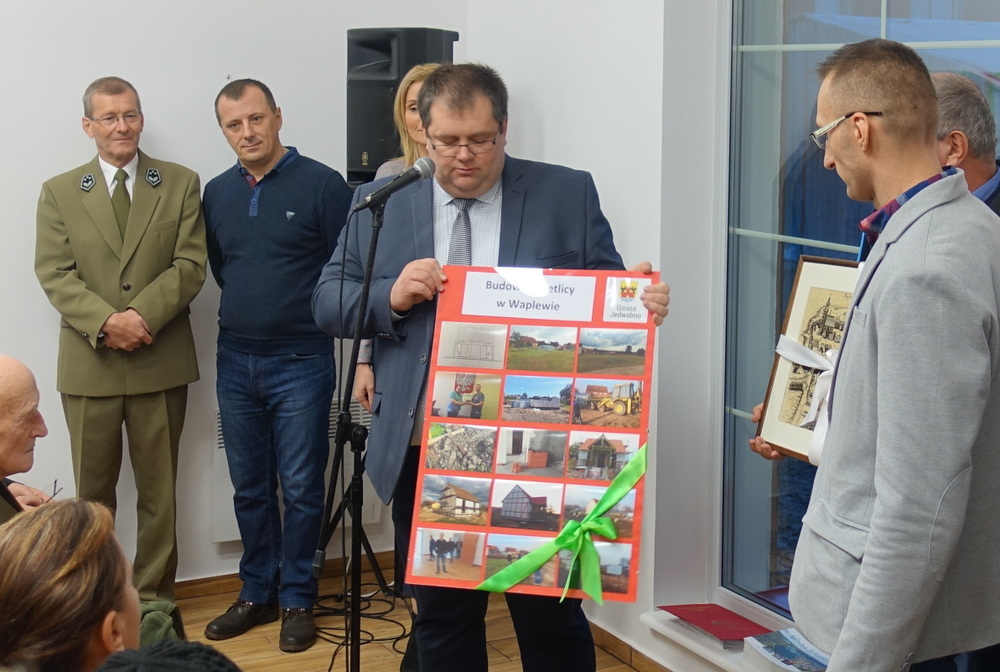 Gości powitał Sołtys Waplewa Adam Szewczyk wraz z Wójtem Gminy Jedwabno Sławomirem Ambroziakiem. Wśród osób, które zaszczyciły nas swoją obecnością była m.in. Sylwia Jaskulska Członek Zarządu Województwa Warmińsko-Mazurskiego, Elżbieta Brzóska Przewodnicząca Rady Gminy Jedwabno oraz Partnerzy realizacji projektu: przedstawiciel Nadleśnictwa Jedwabno Pan Andrzej Maciejczuk, Dyrektor Muzeum Mazurskiego w Szczytnie Pan Klaudiusz Woźniak, Prezes Mazurskiego Stowarzyszenia Regionalnego Pan Witold Olbryś, Prezes OSP Burdąg Pan Józef Dawid oraz właściciel firmy z Waplewa Mirosław Rumiński.