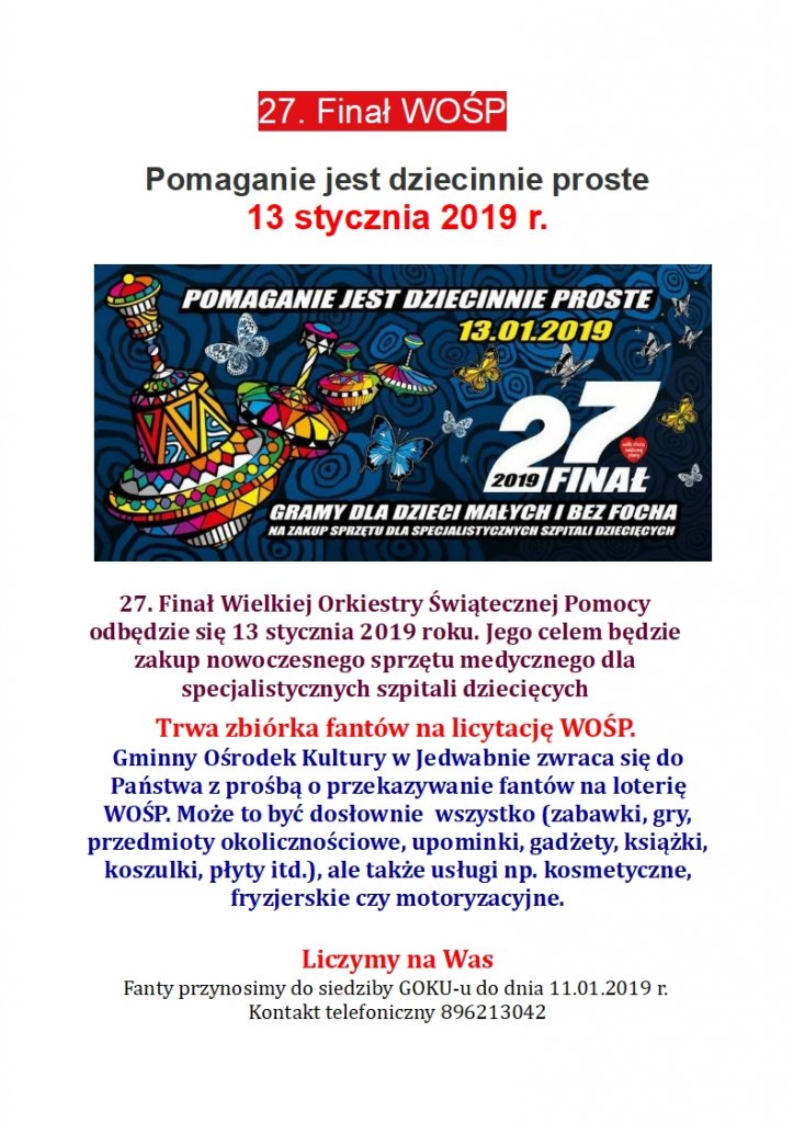 Już po raz 27 gra Wielka Orkiestra Świątecznej Pomocy. Nasza Gmina poprzez Gminny Ośrodek Kultury w Jedwabnie również chce włączyć się w to pomaganie, dlatego trwa zbiórka fantów na aukcje dla WOŚP w Gminny Ośrodek Kultury w Jedwabnie.