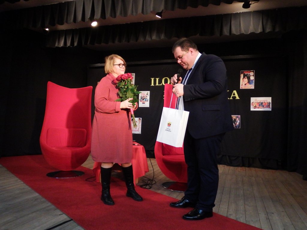Nie mogło się obyć także bez szczegółów z życia prywatnego. Uczestnicy spotkania dowiedzieli się m.in., że Pani Ilona jest niesamowitym kibicem dyscyplin sportowych, czy że jej mąż w sposób szczególny nie śledzi jej seriali emitowanych w telewizji. Równie ciekawym wątkiem spotkania okazała się opowieść, jak Pani Ilona wraz ze swoją córką, mężem i psem stała się mieszkanką Burdąga. A słowa wypowiedziane przez scenarzystkę „…trafiliśmy do Burdąga znaleźliśmy tam malutki domek i w tym domku napisałam mnóstwo scenariuszy. Napisałam tam Barwy Szczęścia. To jest serial z Burdąga” wszystkich napawały dumą. Okazało się, że jako mieszkanka Burdąga, Pani Ilona bardzo interesuję się tym co dzieje się w Naszej Gminie. Bardzo spodobał jej się Kalendarz Imprez na 2019 rok obfitujący w wiele ciekawych wydarzeń przyznała, że nawet brała udział w kilku gminnych imprezach w zeszłym roku. Pochwaliła organizację związaną z odbiorem odpadów, czy Punktu Selektywnego Zbierania Odpadów Komunalnych (PSZOK) prowadzonego przez Zakład Gospodarki Komunalnej w Jedwabnie. Porównując problem odbioru odpadów do dzielnicy Warszawy, w której mieszka „U Nas w Warszawie ten problem nie jest jeszcze rozwiązany. Fantastycznie sobie z tym poradziliście” -dodała. Na konto Gminy Jedwabno wpadł także jeden minus , a mianowicie autorka ubolewała, że nie ma już dawnego kiosku z rybami, gdzie chętnie kupowała świeże specjały Mazur.