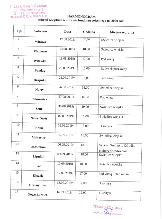 Szanowni Państwo zapraszamy do zapoznania się z harmonogramem zebrań wiejskich w sprawie funduszu sołeckiego na 2020 rok