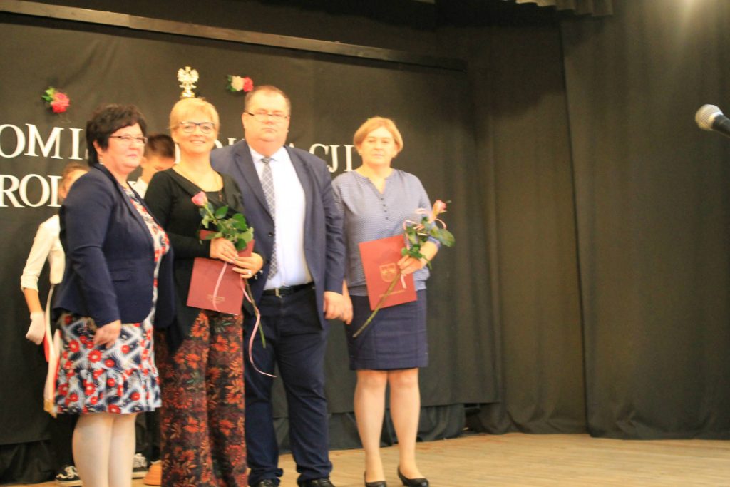 Podczas akademii Pani Agata Kowalczyk oraz Pani Dorota Lemańska otrzymały Roczną Nagrodę Wójta Gminy Jedwabno, którą wręczył oczywiście sam Wójt Gminy Jedwabno Sławomir Ambroziak w obecności Pani Jolanty Drężek Sekretarz Gminy Jedwabno.