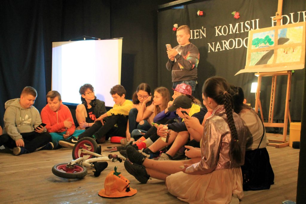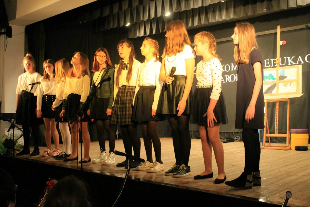 W części artystycznej scena należała do klasy VII a. Zaprezentowali oni swój autorski program pokazujący uczniów podczas przygotowywania prezentacji o patronie szkoły. Młodzi aktorzy poszukiwali informacji o Komisji Edukacji Narodowej, zastanawiali się dlaczego nasza szkoła nosi takie imię i starali się dociec sensu edukowania młodzieży. Nie brakowało zabawnych sytuacji i komicznych pomyłek w młodzieżowym stylu. Warto wspomnieć, że uczniowie tej klasy od czterech lat w pełnym składzie uczestniczą we wszystkich wycieczkach do teatru oraz przygotowują apele szkolne. Bazując na własnych doświadczeniach, współtworzyli scenariusz przedstawienia. Na pochwałę zasługuje również fakt, że kolejny raz zobaczyliśmy na scenie całą klasę, gdzie każdy uczeń był zaangażowany w przygotowania i prezentację. Dziękuje również pani Justynie Dęby za pomoc w realizacji przedsięwzięcia.