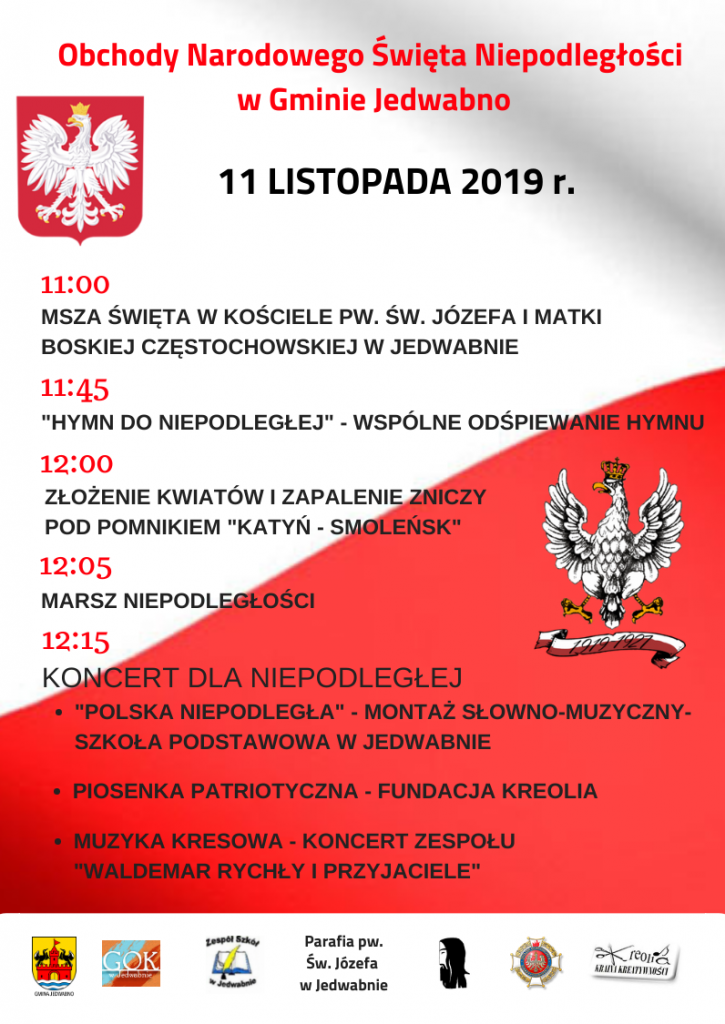 Zapraszamy na Obchody Narodowego Święta Niepodległości w Gminie Jedwabno, 11.11.2019 rok
