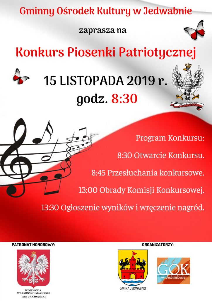 Szanowni Państwo, zachęcamy do wzięcia udziału w cyklicznie organizowanym przez Gminny Ośrodek Kultury w Jedwabnie Konkursie Piosenki Patriotycznej w tym roku pod Patronatem Honorowym Wojewody Warmińsko – Mazurskiego Artura Chojeckiego.