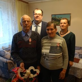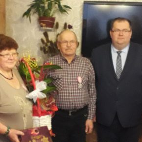 Wójt Gminy dziękując Jubilatom za godne i długie pożycie małżeńskie odznaczył w imieniu Prezydenta RP Medalami za Długoletnie Pożycie Małżeńskie.