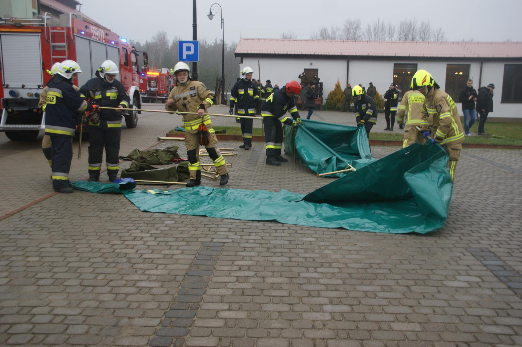 „Trójka mężczyzn włamała się do obiektu i podpaliła pomieszczenia piwniczne, w których składowane były szyszki. Zgromadzony materiał palny i drewniane stropy kilkukondygnacyjnego obiektu, spowodowały bardzo szybkie rozprzestrzenianie się pożaru, który został zauważony przez przypadkową osobę. Pierwsze przybyłe na miejsce zdarzenia zastępy straży pożarnej, skupiły się na prowadzeniu działań wewnątrz obiektu. W piwnicy strażacy znaleźli mocno poparzonego jednego ze sprawców podpalenia, któremu po ewakuacji udzielili pierwszej pomocy przedmedycznej. Bardzo szybko okazało się, że w sieci hydrantowej nie ma wody – kilka godzin wcześniej przepompownia wody uległa poważnej awarii. Kierujący Działaniem Ratowniczym wzywa kolejne siły i środki. Od pracownika Urzędu Gminy, który przybył na miejsce zdarzenia, KDR dowiaduje się, że najbliższy naturalny zbiornik wodny zlokalizowany jest w odległości około 1 km. przy oczyszczalni ścieków. Zapada decyzja o zbudowaniu stanowiska wodnego przy zbiorniku i zastosowaniu metody przetłaczania wody do miejsca pożaru. W trakcie prowadzonych działań gaśniczych ratownicy zlokalizowani w okolicy płonącego budynku, pod pryzmą drewnianych kłód drewna rannego mężczyznę (to drugi z podpalaczy). Za pomocą zestawu poduszek pneumatycznych unieśli kłody i ewakuowali rannego z licznymi złamaniami do punktu udzielania pomocy medycznej. Po kilkudziesięciu minutach do strażaków dociera informacja, że w składowisku zużytych betonowych elementów budowlanych, przypadkowa osoba natknęła się na przyciśniętego betonem mężczyznę (to trzeci podpalacz). Straży za pomocą narzędzi hydraulicznych podnieśli betonowy element, ewakuowali mężczyznę. Niestety ratownicy ZRM stwierdzili zgon.”
