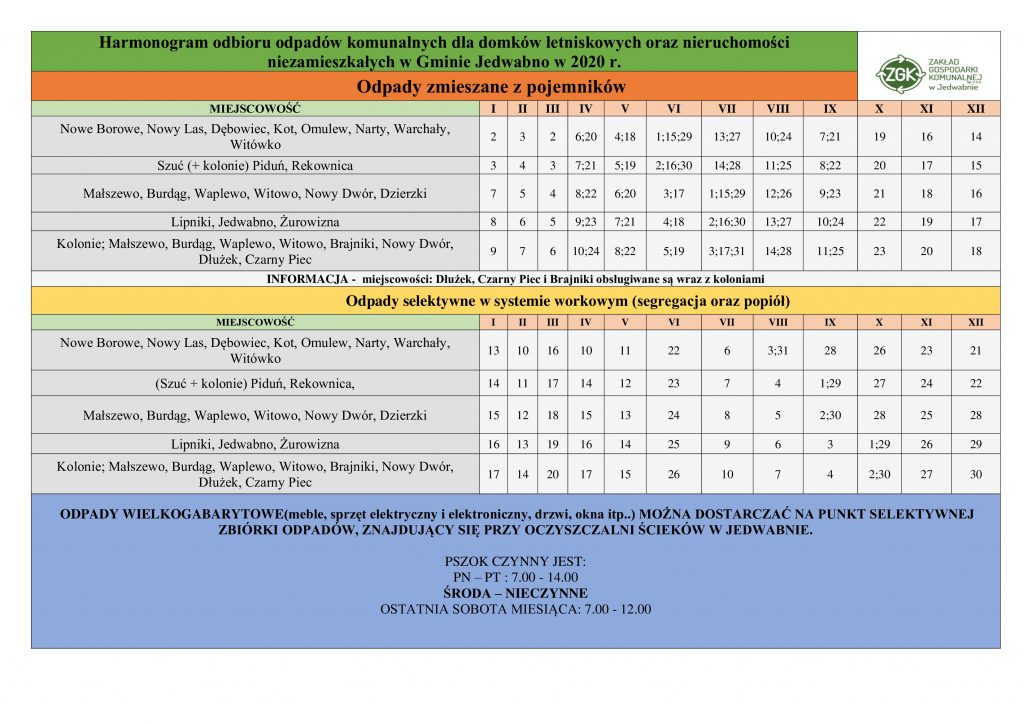 Harmonogram wywozów odpadów na dla domków letniskowych i nieruchomości niezamieszkałych r.