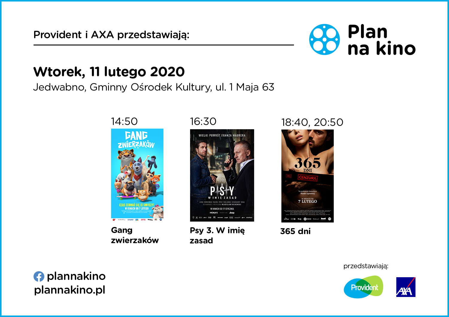 Szanowni Państwo dnia 11.02.2020 roku na sali kinowej w Gminnym Ośrodku Kultury w Jedwabnie zagości kino. Plan na kino przedstawiają PROVIDENT I AXA
