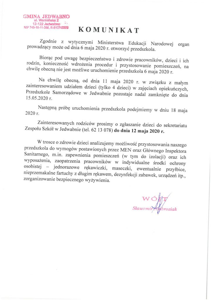 3. Komunikat dotyczący przedszkola w Jedwabnie
