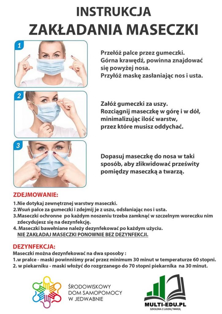13 maja 2020 roku pracownicy Środowiskowego Domu Samopomocy w Jedwabnie skończyli szycie maseczek dla seniorów z terenu Gminy Jedwabno. Z materiałów zakupionych przez Urząd Gminy w Jedwabnie powstało 520 sztuk maseczek. Tkanina, którą wykorzystano do szycia, to przewiewna a jednocześnie wytrzymała bawełna, dzięki czemu maseczka nie utrudnia oddychania i można ją wielokrotnie prać w wymaganej temperaturze 60 stopni. Do każdej maseczki dołączono instrukcję jej użytkowania, gdyż bardzo ważne jest aby maseczkę w prawidłowy sposób zakładać, zdejmować oraz dezynfekować.