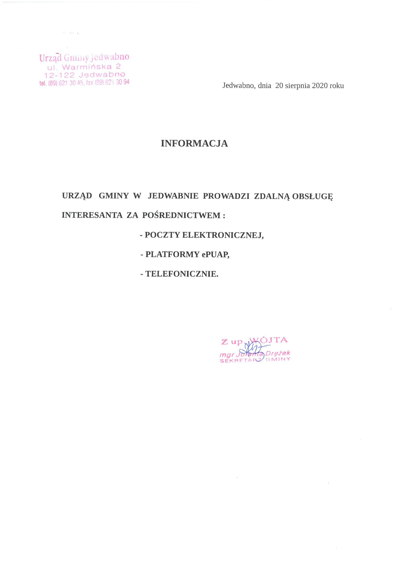Urząd Gminy w Jedwabnie ul. Warmińska 2, tel. 89/6213045, fax. 6213094, |ug@jedwabno.pl