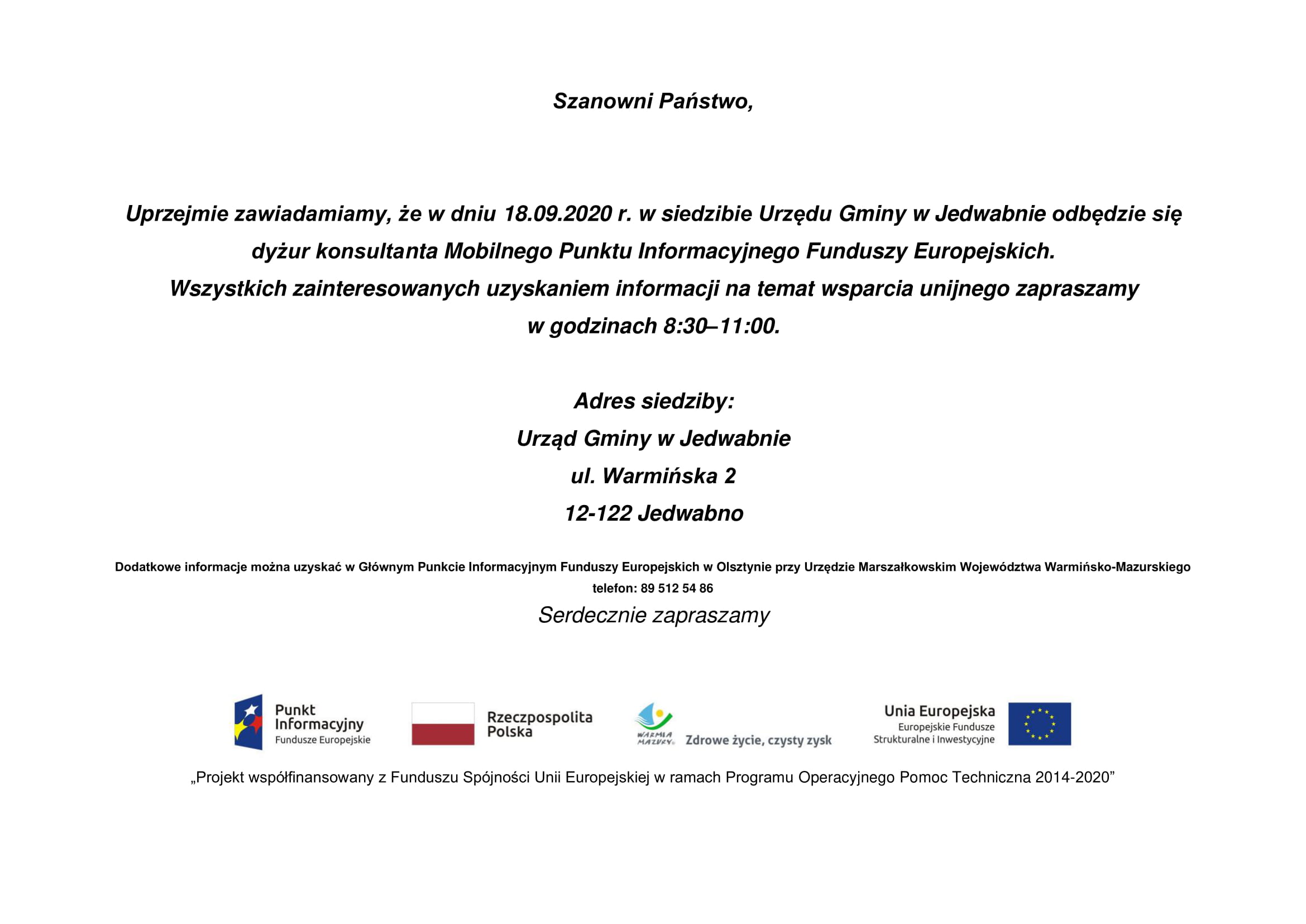 3. Mobilny Punkt Informacyjny Funduszy Europejskich 18.09.2020 r. w Urzędzie Gminy w Jedwabnie
