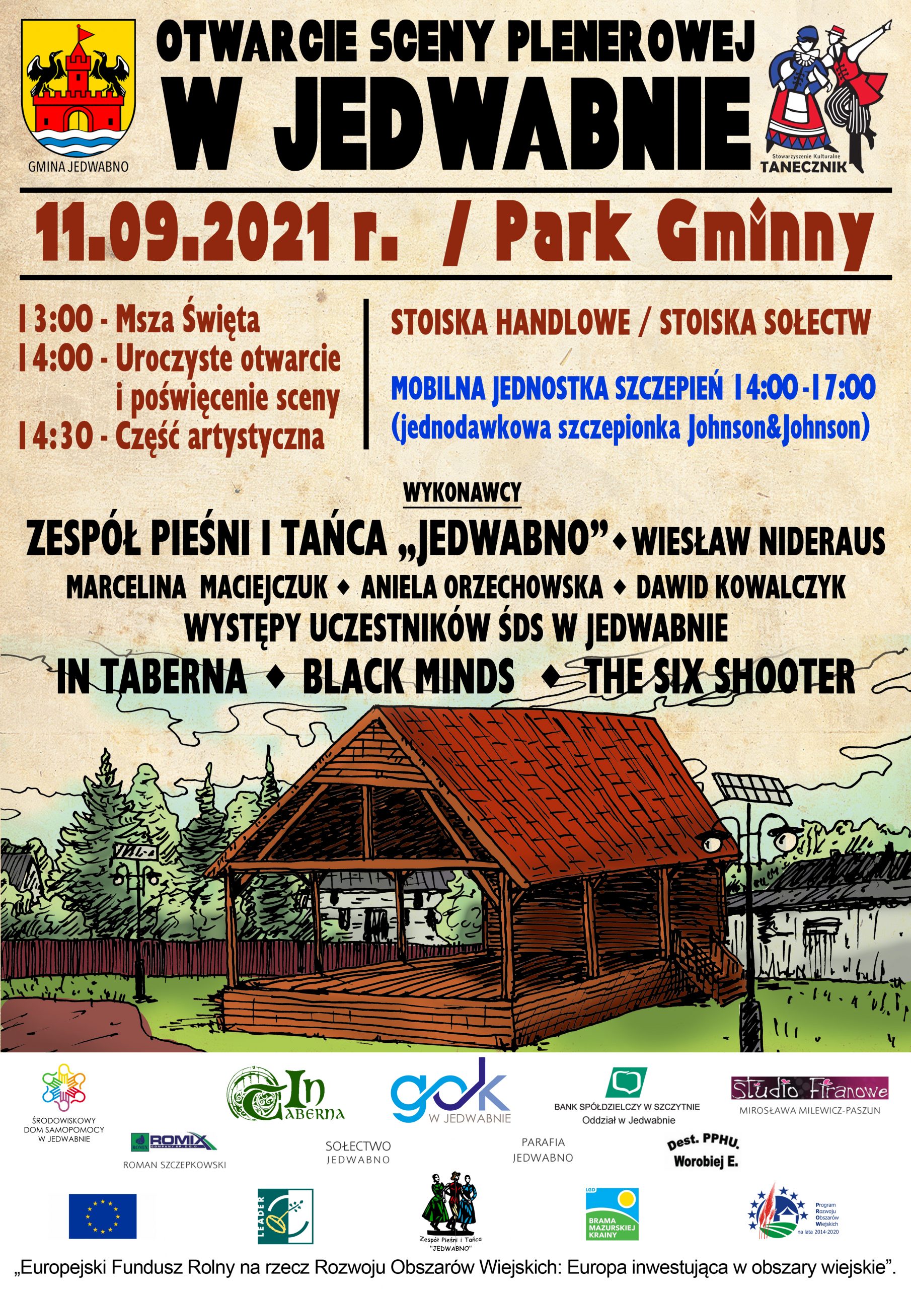 Serdecznie zapraszamy na uroczyste otwarcie Sceny Plenerowej w Jedwabnie. Nie zabraknie też ciekawych stoisk i występów lokalnych artystów. Odwiedzi nas także MOBILNA JEDNOSTKA SZCZEPIEŃ w godz. 14:00 -17:00 z jednodawkową szczepionką Johnson&Johnson. Nie może Was tam zabraknąć!