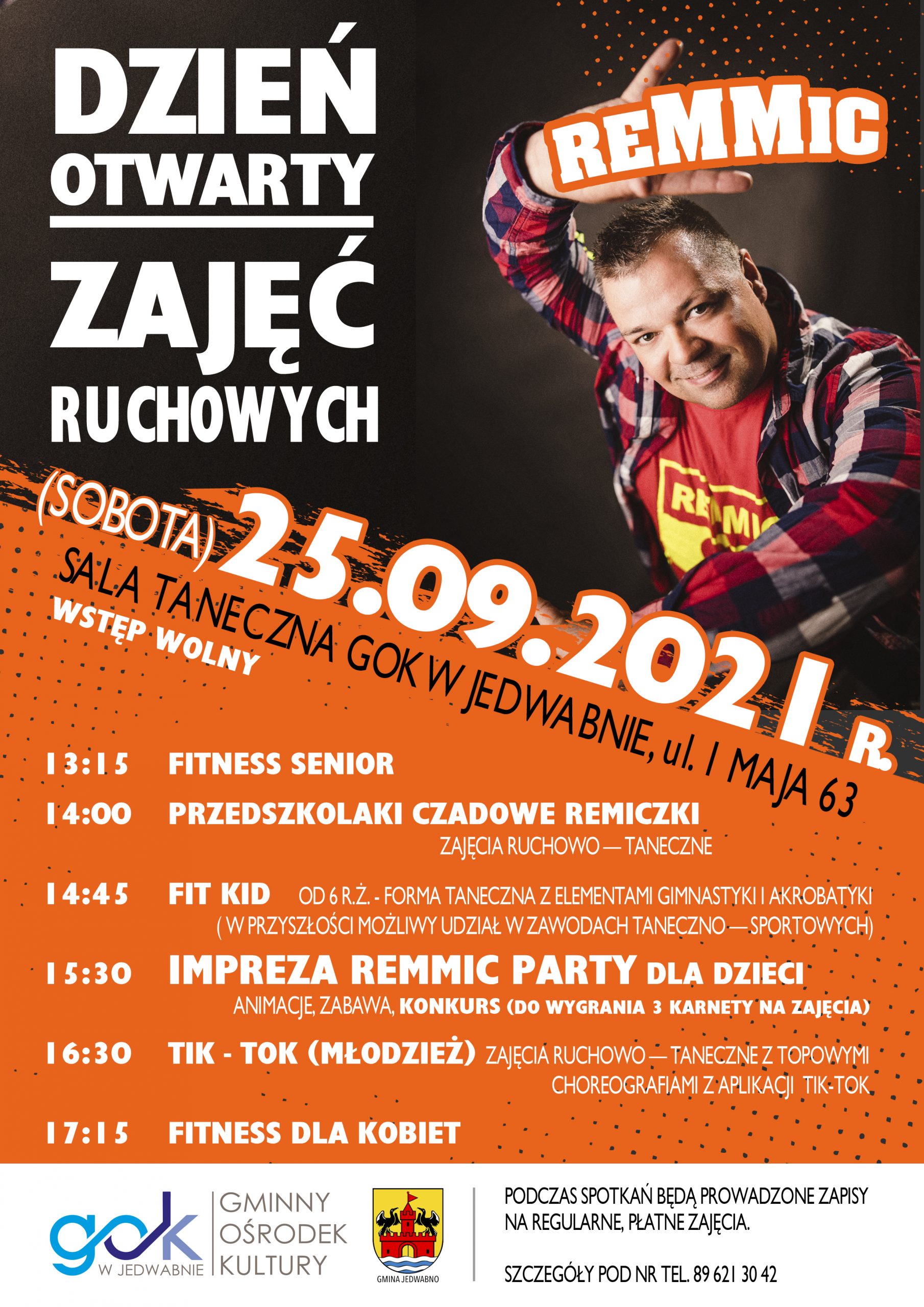 Zapraszamy na DZIEŃ OTWARTY ZAJĘĆ RUCHOWYCH do sali tanecznej w Gminnym Ośrodku Kultury w Jedwabnie 25.09.2021 r. Wstęp wolny.