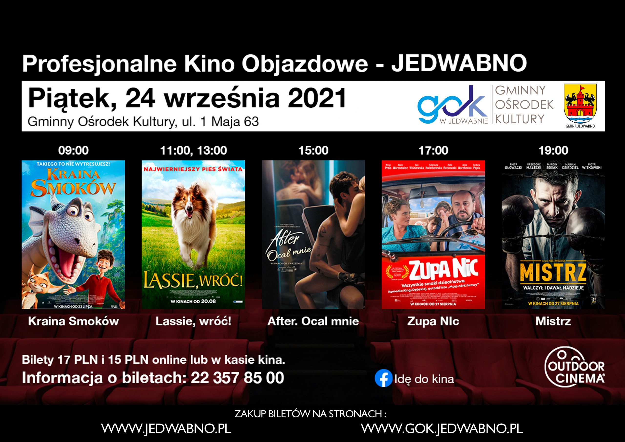 Z przyjemnością informujemy, że w dniu 24.09.2021 r. (piątek) w Gminnym Ośrodku Kultury w Jedwabnie zagości Profesjonalne Kino Objazdowe.