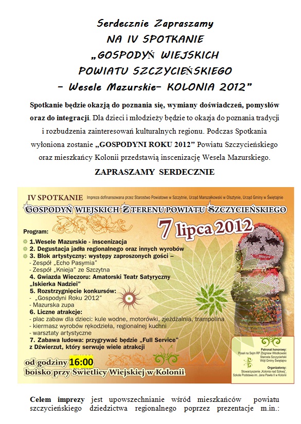 Zaproszenie na IV SPOTKANIE ?GOSPODYŃ WIEJSKICH POWIATU SZCZYCIEŃSKIEGO ? Wesele Mazurskie? KOLONIA 2012?