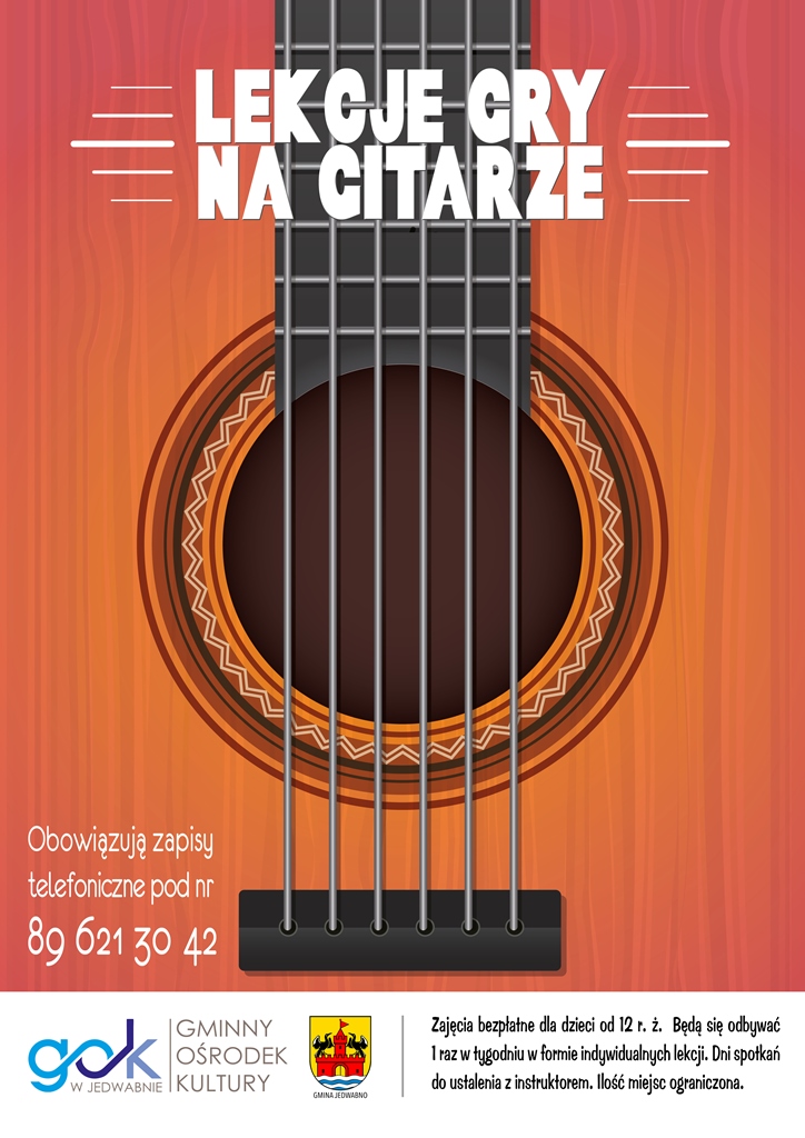 Gminny Ośrodek Kultury w Jedwabnie prowadzi nabór na bezpłatne lekcje gry na gitarze dla dzieci od 12 r.ż. Zajęcia będą odbywały się 1 raz w tygodniu w formie indywidualnych lekcji. Dni spotkań do ustalenia z instruktorem. Ilość miejsc ograniczona. Zapraszamy do zapisów pod nr tel. 89 621 30 42.
